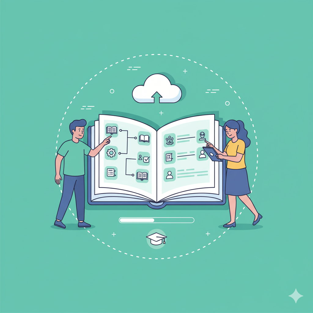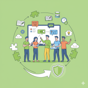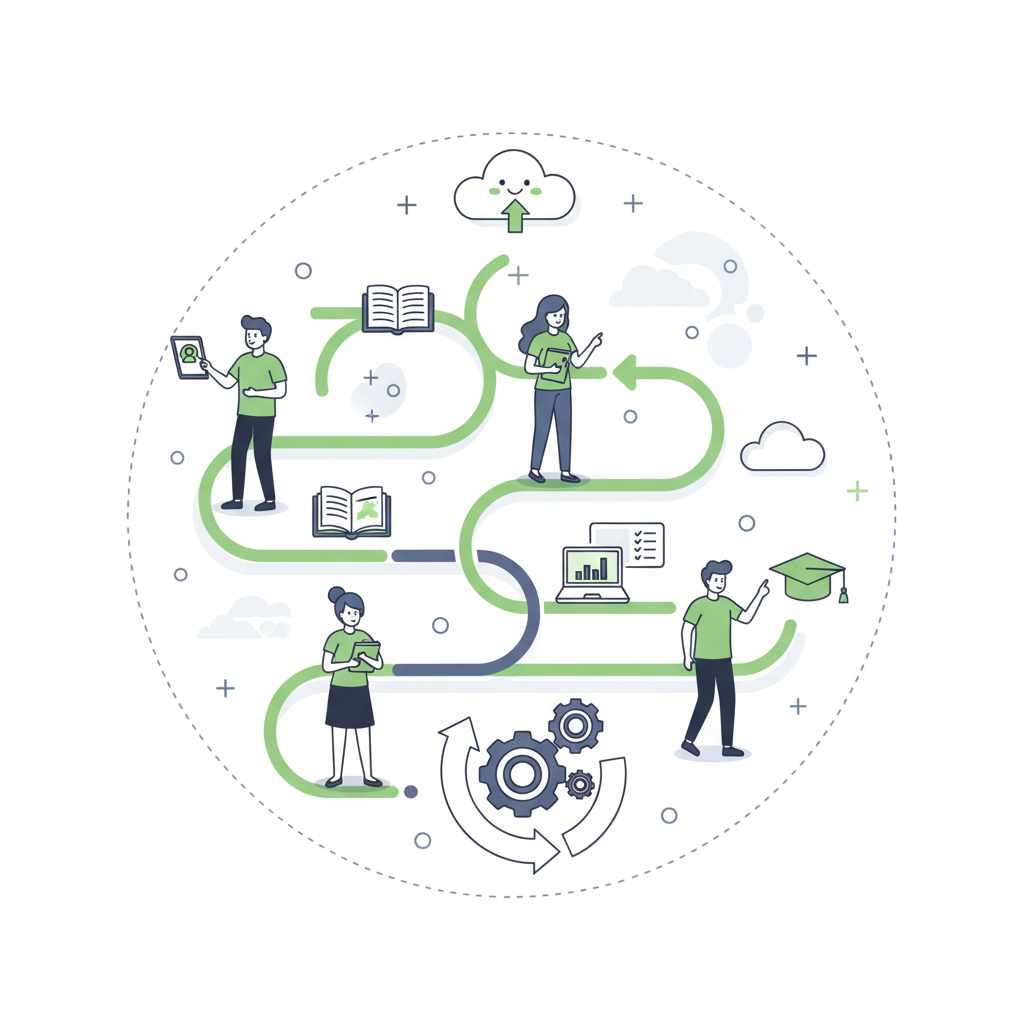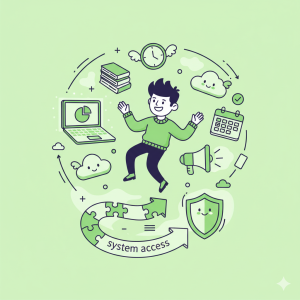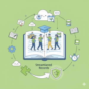 A Thread: We’re a software company focused on student and learning management systems. Create a modern cartoon-style image in a 3:4 ratio for a website with a clean, minimal design. Use #0ac251 as the main color with shadow accents in #142535. The theme is “making admin work fun” — professional with a casual touch. No text in the image. Each image is unique and different from the last. I’ll provide the subject next. Ready?